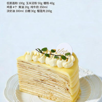 千层皮(Crepe):由低筋面粉、鸡蛋、牛奶、糖和融化黄油混合成的面糊,过筛后在平底锅中小火摊成薄如蝉翼的饼皮。